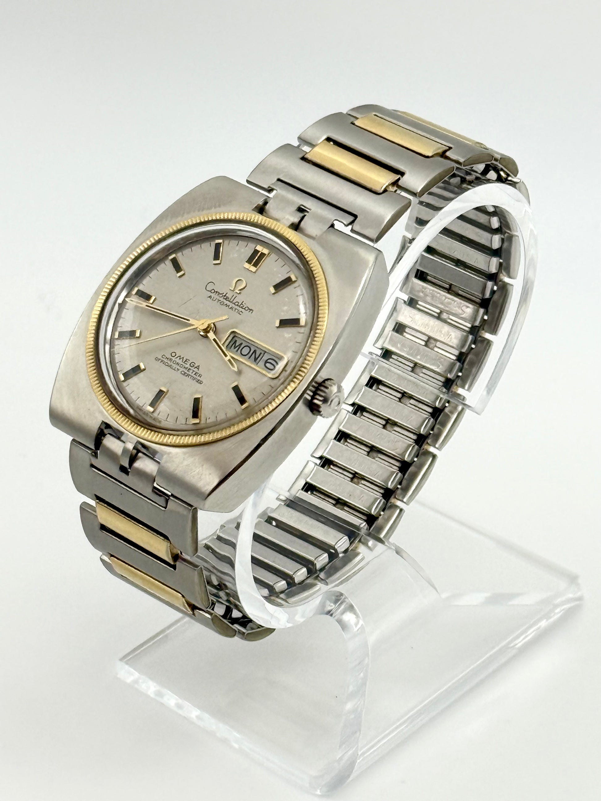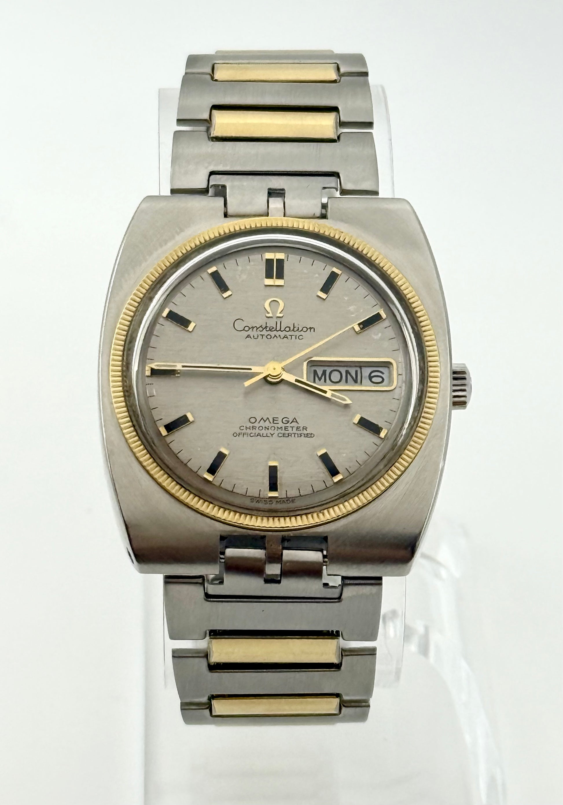 Precioso reloj Omega Constellation vintage de 1970, fabricado en Suiza, movimiento automático, caja de acero inoxidable y bisel de oro amarillo de 18 quilates, cronómetro, indicador de fecha y día, elegante y sofisticado, en excelente estado y funcionando perfectamente.