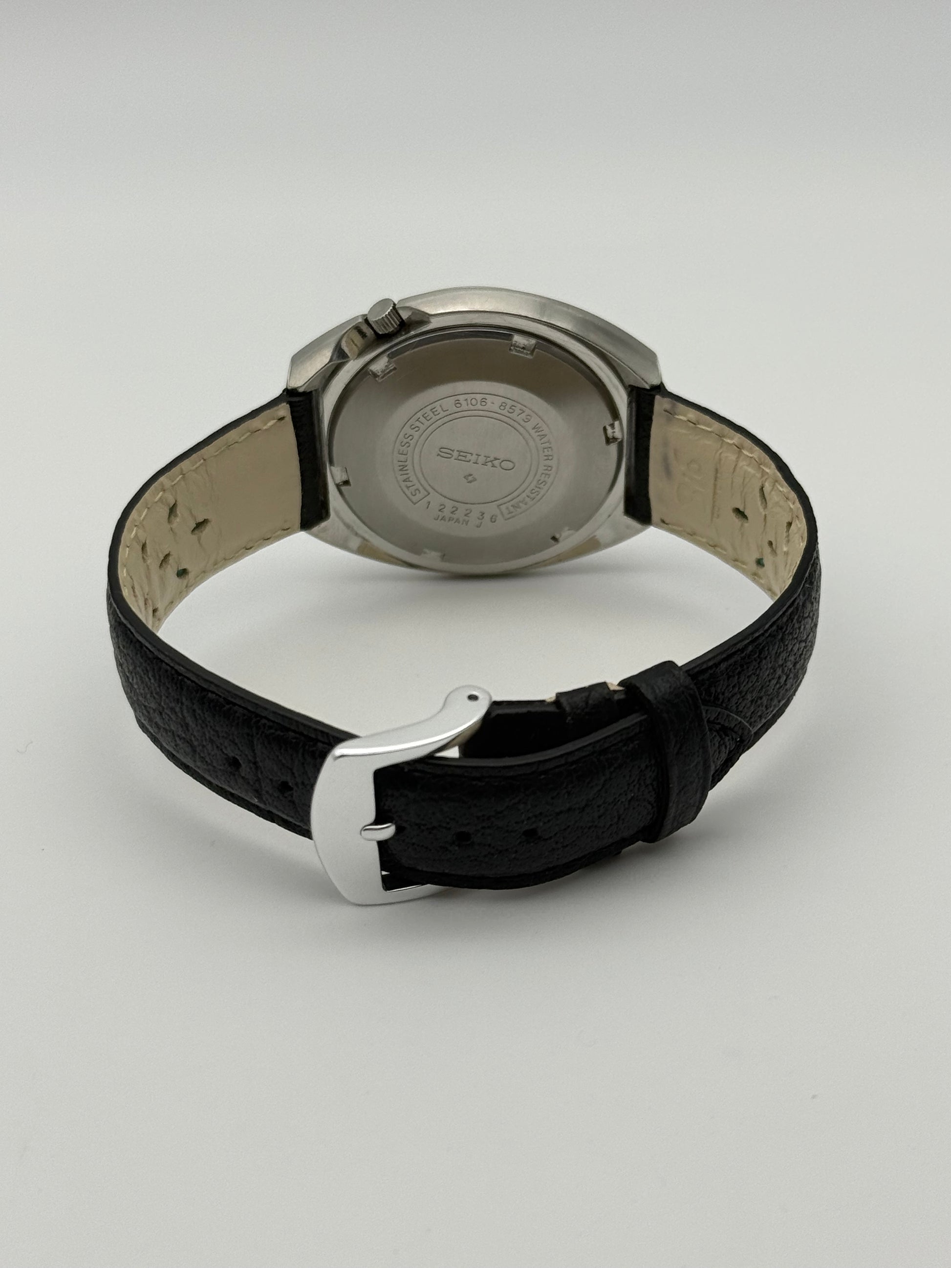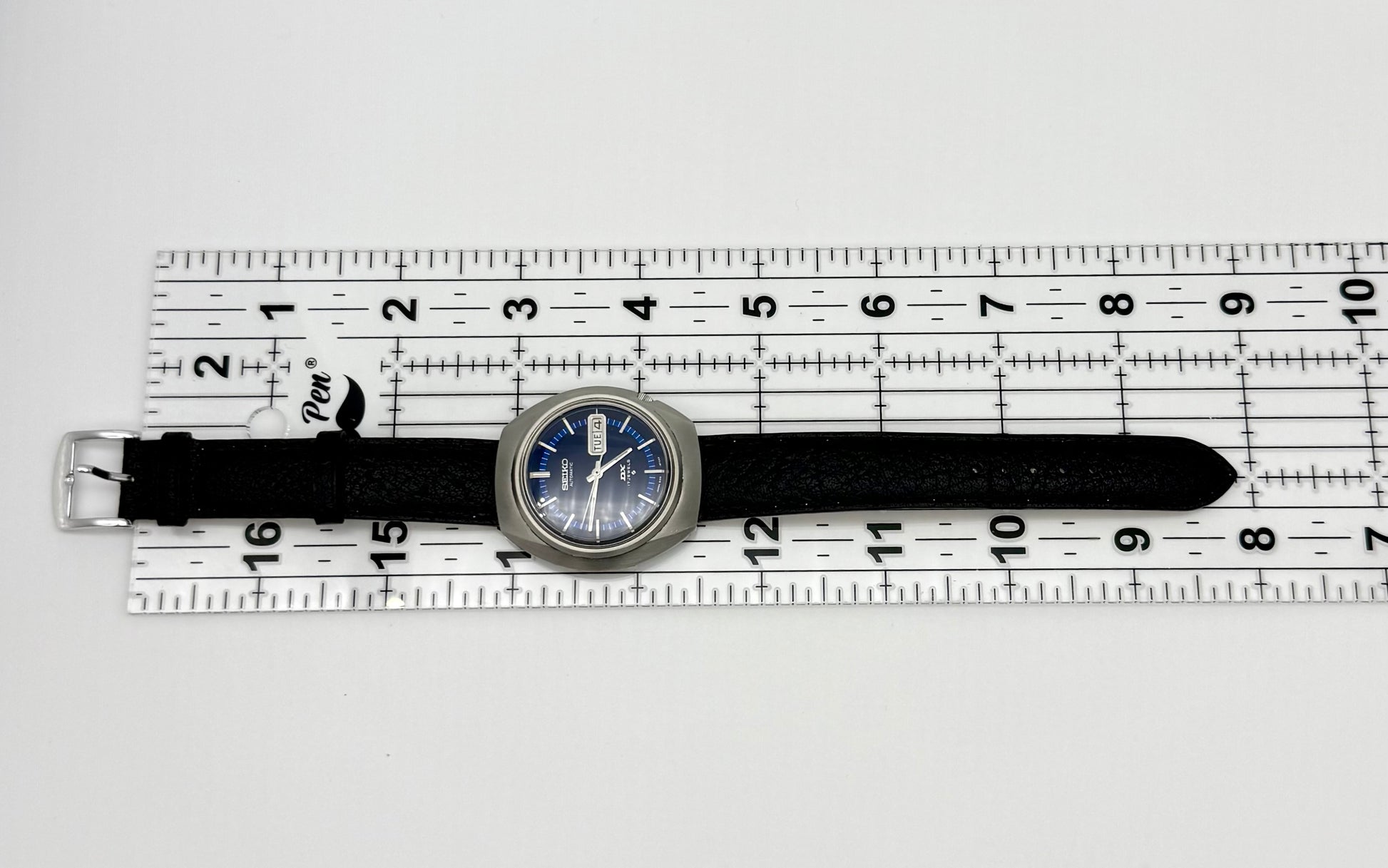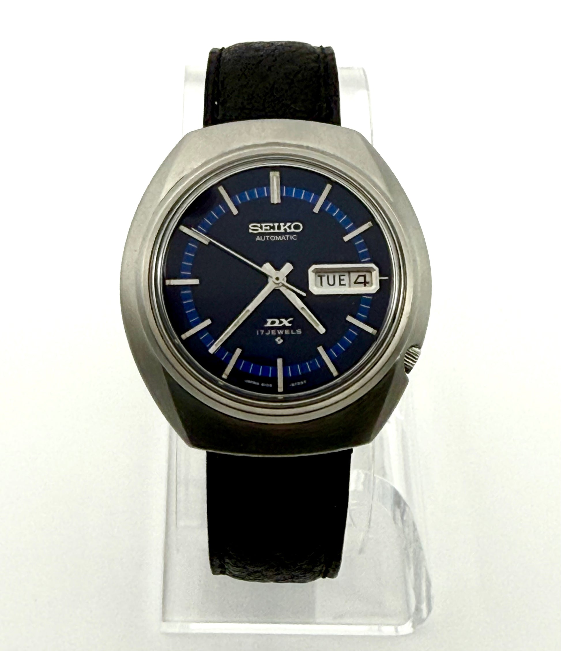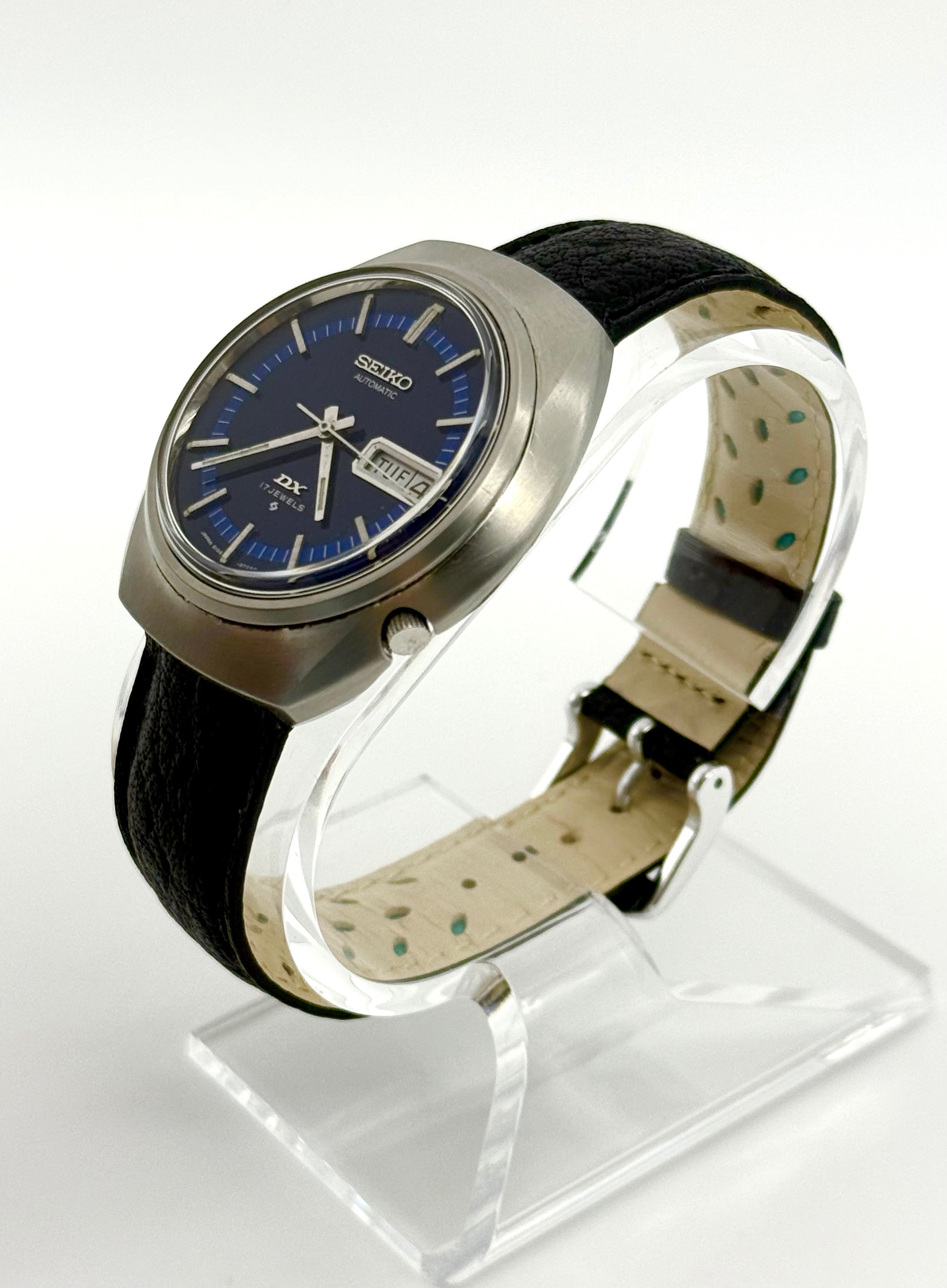 Vintage 1971 Seiko DX automatic watch, 39mm size case, 8in wrist leather band.